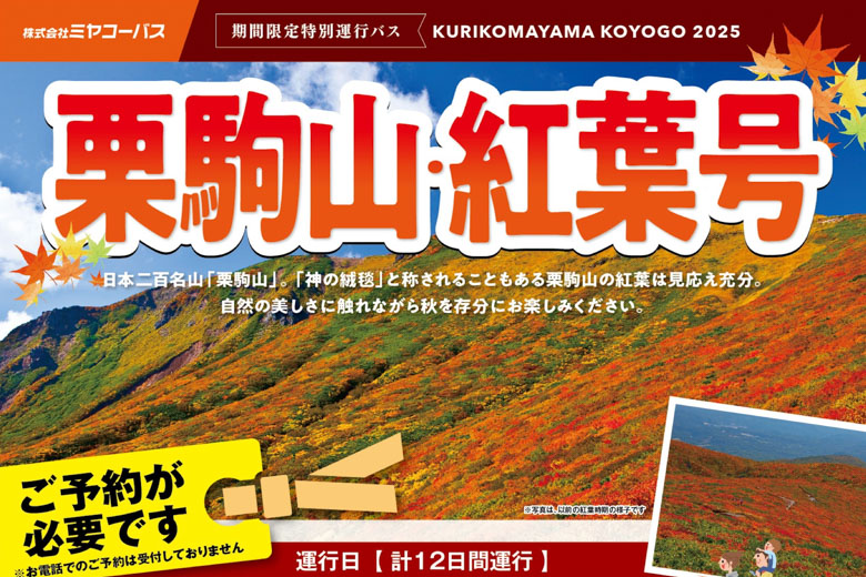 JRくりこま高原駅(東北新幹線)、いわかがみ平(中央登山口、東栗駒登山口)を結ぶ、紅葉時季限定のバスが運行されます。